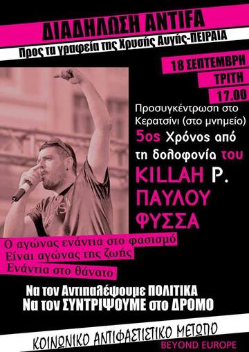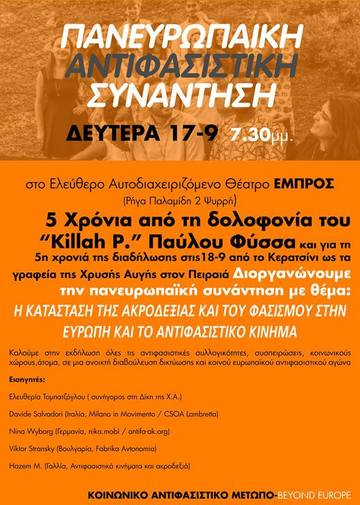 5 Χρόνια μετά τη δολοφονία του "Killah P" Παύλου Φύσσα και ενόψει της διαδήλωσης στις 18-9, από το Κερατσίνι στα γραφεία της Χρυσής Αυγής στον Πειραιά, διοργανώνουμε την πανευρωπαϊκή συνάντηση με θέμα: