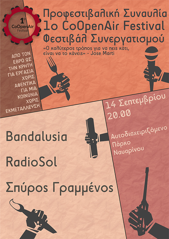 Με πρόταγμα μας, τα λόγια του Jose Marti «Ο καλύτερος τρόπος για να πεις κάτι είναι να το κάνεις», στο πλαίσιο του 1ου Φεστιβάλ Συνεργατισμού CoOpenAir Festival που θα πραγματοποιηθεί τον Οκτώβριο στο κατειλημμένο εργοστάσιο της ΒΙΟΜΕ, διοργανώνουμε προφεστιβαλική συναυλία στις 14 Σεπτεμβρίου στΑυτοδιαχειριζόμενο Πάρκο Ναυαρίνου.