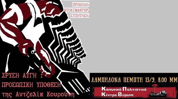 Πέμπτη 13 Σεπτεμβρίου, στις 8.00μμ: Το ΚΠΚΒ στα πλαίσια του αντιφασιστικού Σεπτέμβρη, θα προβάλλει το ντοκιμαντέρ της Αντζελίκ Κουρούνη "ΧΡΥΣΗ ΑΥΓΗ: ΠΡΟΣΩΠΙΚΗ ΥΠΟΘΕΣΗ". Θα ακολουθήσει συζήτηση με αρχικές τοποθετήσεις από δημοσιογράφο του OmniaTV (συντελεστή του ντοκιμαντέρ) και μέλος της συνέλευσης του ΚΠΚΒ. Η συζήτηση φιλοδοξούμε να μην περιοριστεί στη δράση του ναζιστικού μορφώματος, αλλά να θίξει και το ευρύτερο ζήτημα του εκφασισμού μεγάλου τμήματος της ελληνικής κοινωνίας.