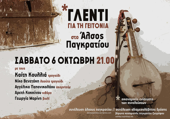 Το Σάββατο 06/10, στις 9.00μμ., στο Άλσος Παγκρατίου, θα πραγματοποιήσουμε το καθιερωμένο ετήσιο παραδοσιακό γλέντι με την Καίτη Κουλλιά και το συγκρότημά της. Τα έσοδα θα διατεθούν για την οικονομική ενίσχυση των δύο συνελεύσεων.