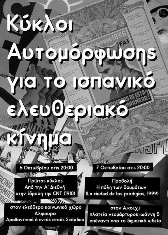 Στις 6 Οκτωβρίου, ο Ελεύθερος κοινωνικός χώρος Αλιμούρα και ο Αυτοδιαχειριζόμενος Κοινωνικός Χώρος Ιωαννίνων (Α.Κοι.Χ.Ι.) σας προσκαλούν να συμμετάσχετε στην πρώτη συνάντηση των κύκλων αυτομόρφωσης για το ισπανικό ελευθεριακό κίνημα, μια προσέγγιση στην ιστορία του αναρχικού κινήματος της Ισπανίας, από το 19ο αιώνα μέχρι και τις μέρες μας.