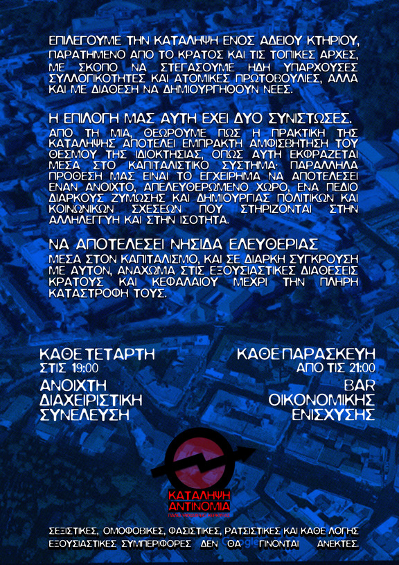 Η πράξη αυτή προέκυψε από την ανάγκη δημιουργίας ενός πολιτικού/κοινωνικού χώρου με βασικούς πυλώνες την αυτοοργάνωση και την αντιεξουσία, που θα στεγάσει τον λόγο και την πράξη μας. Επιλέγουμε την κατάληψη ενός άδειου κτηρίου, παρατημένο από το κράτος και τις τοπικές αρχές, με σκοπό να στεγάσουμε ήδη υπάρχουσες συλλογικότητες και ατομικές πρωτοβουλίες, αλλά και με διάθεση να δημιουργηθούν νέες μέσα στην κατάληψη.