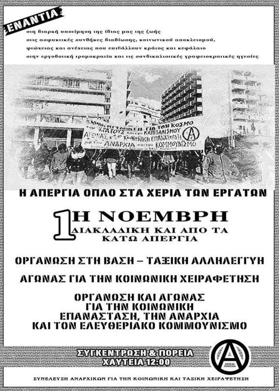 Στην κατεύθυνση αυτή καλούμε σε στήριξη και ενίσχυση μιας διαφορετικής απεργίας, που έχει κηρυχθεί για την Πέμπτη 1η Νοέμβρη σε μια σειρά από κλάδους και επιχειρήσεις με αποφάσεις γενικών συνελεύσεων σωματείων, ως αποτέλεσμα της οριζόντιας διεργασίας συντονισμού τους από τον Μάϊο. Ενός από τα κάτω οργανωμένου μετώπου προάσπισης εργατικών συμφερόντων και δικαιωμάτων που ξεδιπλώνει αγωνιστικούς σχεδιασμούς χωρίς να επηρεάζεται από τους ελιγμούς και τα παζάρια των γραφειοκρατικών συνδικαλιστικών ηγεσιών των ΓΣΕΕ - ΑΔΕΔΥ. Με ήδη ορατό αποτύπωμα σε άλλες διεργασίες πολύ ευρύτερες από αυτές των άμεσα εμπλεκομένων. Ενάντια στη λογική της "ταξικής συνεργασίας" -δηλαδή της ταξικής υποταγής- και των δήθεν κοινών συμφερόντων ανάμεσα στους εργαζόμενους και τα αφεντικά, που δοκιμάζουν, ολοένα και πιο ξεδιάντροπα, να προωθήσουν το τελευταίο διάστημα οι ηγεσίες αυτές με τη λεγόμενη "κοινωνική συμμαχία". Κόντρα στην ανάθεση και μακριά από αυταπάτες για "λύσεις" που θα έρθουν από "ειδικούς" και "σωτήρες", με την κοινή πεποίθηση ότι οι απεργίες αποκτούν δυναμική μέσα από την οργάνωση στη βάση. Μέσα από αυτοοργανωμένες δομές, με όλους τους εργαζομένους συμμέτοχους, ώστε να κάνουμε δική μας υπόθεση τη διασφάλιση του ακηδεμόνευτου χαρακτήρα τους και η κατεύθυνσή τους να υπηρετεί τα δικά μας συμφέροντα.