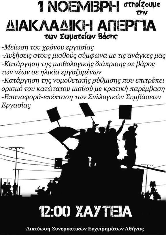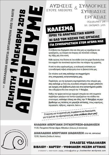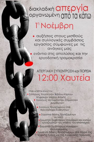 Η προκήρυξη διακλαδικής απεργίας, οργανωμένης από τα κάτω, για την 1η Νοέμβρη, από τον Σύλλογο Υπαλλήλων Βιβλίου - Χάρτου - Ψηφιακών Μέσων Αττικής, τον Σύλλογο Μεταφραστών Επιμελητών Διορθωτών, τον Σύλλογο Εργαζομένων στα Φροντιστήρια Καθηγητών, το Σωματείο Βάσης Εργαζομένων σε ΜΚΟ, το Σωματείο Σερβιτόρων Μαγείρων και λοιπών εργαζομένων του κλάδου του επισιτισμού από την Αθήνα αλλά και το Σωματείο Σερβιτόρων Μαγείρων Θεσσαλονίκης και το Σωματείο Βάσης Εργαζομένων στο χώρο της Ψυχικής Υγείας και της Κοινωνικής Πρόνοιας από τη Θεσσαλονίκη, αποτελεί μια ιδιαίτερα σημαντική προσπάθεια συντονισμού και διεκδίκησης από τους ίδιους τους εργαζόμενους και τα πρωτοβάθμια σωματεία τους.