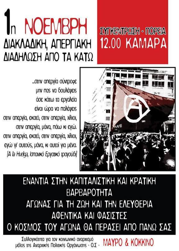 Η προώθηση των διαδικασιών της κρατικής και καπιταλιστικής αναδιάρθρωσης εντείνει με γοργούς ρυθμούς τόσο τις συνθήκες υποταγής και το βάθεμα των κοινωνικών και ταξικών αποκλεισμών (σε περίθαλψη, εκπαίδευση, μεταφορές, στέγαση, κλπ.) της πλειοψηφίας, όσο και την επίθεση στον κόσμο της εργασίας με την ολοένα και μεγαλύτερη όξυνση των συνθηκών εκμετάλλευσης.Η επίθεση αυτή συντελεί στην εγκαθίδρυση ενός μεσαίωνα στην εργασιακή πραγματικότητα. Η εργοδοτική αυθαιρεσία σε συνδυασμό με την απελευθέρωση των απολύσεων επιτείνουν την επισφαλή και «μαύρη» εργασία, εντείνουν σε ακραίο βαθμό την εκμετάλλευση χιλιάδων εργαζομένων και θέτουν στο προσκήνιο τον διαρκή εκβιασμό της ανεργίας, την ίδια στιγμή που τα εξαντλητικά ωράρια οδηγούν στην συνεπακόλουθη μείωση ως και εκμηδένιση του ελεύθερου χρόνου όσων εργάζονται. Οι δολοφονίες και το τσάκισμα εργατών/τριών στα κάτεργα της μισθωτής σκλαβιάς συνεχώς αυξάνονται (μόνο το πρώτο επτάμηνο του 2017, 40 εργαζόμενοι έχασαν τη ζωή τους, ενώ δηλώθηκαν συνολικά 4.016 εργατικά ατυχήματα) στο βωμό της καπιταλιστικής και κρατικής κερδοφορίας και ανάπτυξης, ενώ η κατάργηση των συλλογικών συμβάσεων και εργατικών κεκτημένων κατακερματίζει τις ταξικές αντιστάσεις και αποδυναμώνει τις συλλογικές διεκδικήσεις στους χώρους εκμετάλλευσης. Το άνοιγμα των μαγαζιών τις Κυριακές σε εμπορικές ζώνες που χαρακτηρίζονται τουριστικές λειτουργεί ως προθάλαμος για την δημιουργία ενός μοντέλου ευέλικτης και πειθαρχημένης εργασίας. Παράλληλα, η καθιέρωση σε ευρεία κλίμακα του θεσμού της μαθητείας (για παράδειγμα αποφοίτων ΕΠΑΛ στα μέσα μαζικής μεταφοράς), της ενοικιαζόμενης και των υπόλοιπων μορφών ελαστικής-επισφαλούς εργασίας, δημιουργεί μια συνθήκη εργαζόμενων πολλών ταχυτήτων, με αποτέλεσμα την καλλιέργεια συνθηκών κανιβαλισμού στους χώρους δουλειάς και την υποχώρηση της ταξικής αλληλεγγύης.Απέναντι στην εξατομίκευση, τον κανιβαλισμό και τους πλαστούς διαχωρισμούς ανάμεσα στους ανθρώπους της τάξης μας, όλοι μαζί ντόπιοι, μετανάστες, νεολαίοι, φοιτητές, μαθητές, εργαζόμενοι και άνεργοι να πάρουμε τη ζωή στα χέρια μας, να αγωνιστούμε συλλογικά, αυτοοργανωμένα και αδιαμεσολάβητα. Απέναντι στον κόσμο του κράτους και του καπιταλισμού που οργανώνει από τα πάνω και ιεραρχικά την κοινωνική ζωή, τρέφεται από την αδικία, αναπαράγει τις ταξικές αντιθέσεις και τους αποκλεισμούς και νόμος του είναι το δίκαιο του ισχυρού, να οργανώσουμε τον αγώνα μας στη βάση με οριζόντιες διαδικασίες σε κάθε χώρο εκμετάλλευσης, στις γειτονίες, στα σχολεία και τις σχολές. Να δημιουργήσουμε νέες αυτοοργανωμένες πρωτοβουλίες πολιτικού, ταξικού και κοινωνικού αγώνα και να δυναμώσουμε με τη συμμετοχή μας τα σωματεία βάσης, τις συνελεύσεις γειτονίας. Να αρνηθούμε να ζήσουμε σαν δούλοι, να οργανώσουμε την κοινωνική και ταξική αντεπίθεσή μας απέναντι σε κράτος και αφεντικά, με βάση τις αξίες της ισότητας, της συμμετοχής, της αλληλοβοήθειας, της αλληλεγγύης, με βάση τις αξίες του νέου κόσμου που θέλουμε να ζήσουμε.