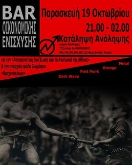 Bar οικονομικής ενίσχυσης της Αναρχικής Ομάδας ''Βραχυκύκλωμα'' και της Αντιφασιστικής Συνέλευσης από τα Ανατολικά της Αθήνας την Παρασκευή 19 Οκτωβρίου(21.00-02.00) στην κατάληψη της Ανάληψης(πάρκο Ανάληψης) στον Βύρωνα