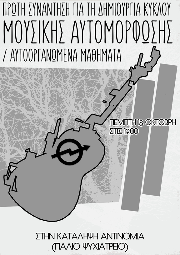 Με γνώμονα την αυτοοργάνωση, για όσους ενδιαφέρονται για μαθήματα κιθάρας, πλήκτρων και θεωρίας της μουσικής (και ο,τι άλλο προκύψει) την Πέμπτη στις 19:00 στην κατάληψη Αντινομια θα πραγματοποιηθεί η πρώτη συζήτηση πάνω στην οργάνωση των μαθημάτων