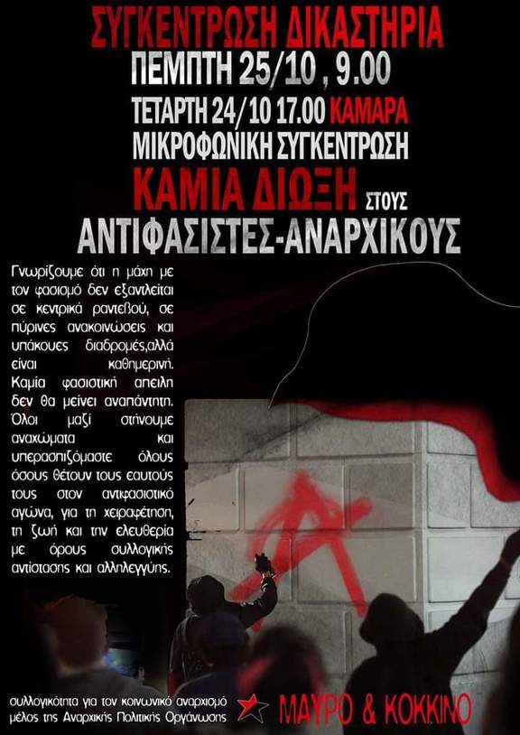 Γνωρίζουμε ότι η μάχη ενάντια στον φασισμό δεν εξαντλείται σε κεντρικά ραντεβού, σε πύρινες ανακοινώσεις και υπάκουες διαδρομές, αλλά είναι καθημερινή και άρρηκτα δεμένη με την υπόθεση της κοινωνικής επανάστασης. Είμαστε βέβαιοι πως δεν θα ζήσουμε ποτέ ελεύθεροι όσο ελλοχεύουν στη γωνία έστω και λίγοι ναζί, γνωρίζοντας καλά ότι ο αγώνας για την συντριβή του συστήματος σημαίνει το τσάκισμα κάθε εθελοντή κέρβερου υπερασπιστή του. Καμία φασιστική απειλή δεν θα μείνει αναπάντητη. Όλοι μαζί στήνουμε αναχώματα και υπερασπιζόμαστε όλους όσους θέτουν τους εαυτούς τους στον αντιφασιστικό αγώνα, για τη χειραφέτηση, τη ζωή και την ελευθερία με όρους συλλογικής αντίστασης και αλληλεγγύης.