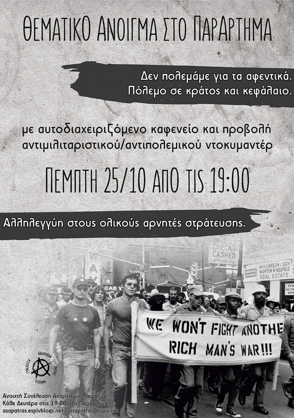 Με αυτοδιαχειριζόμενο καφενείο και προβολή του ντοκυμαντέρ "Πόλεμος ΑΕ" που αποκαλύπτει το εύρος των ιδιωτικών εταιριών, οι οποίες προσφέρουν πολεμικές υπηρεσίες σε ολόκληρο τον πλανήτη .