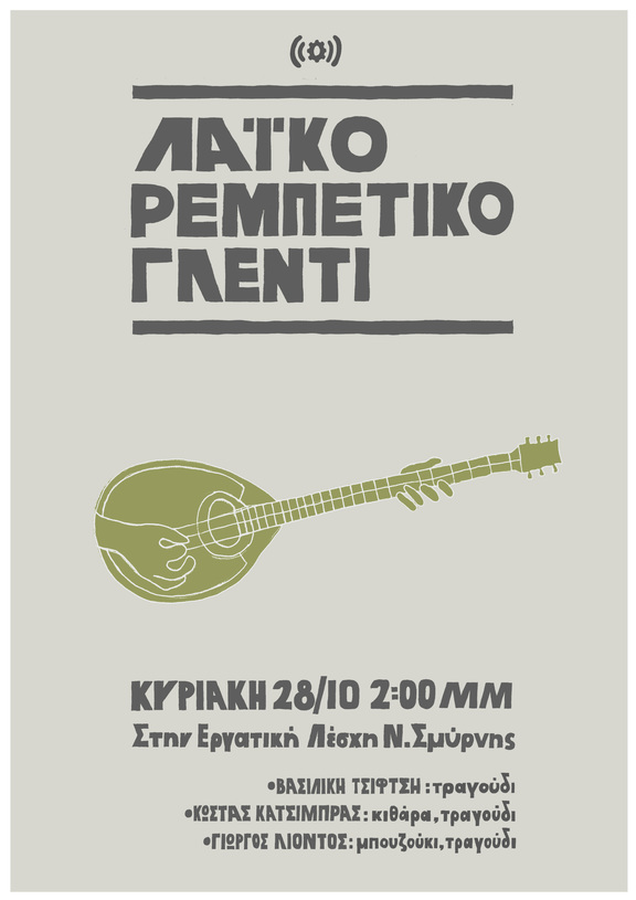 28 Οκτωβρίου.. Η Εργατική Λέσχη Νέας Σμύρνης γλεντάει. Με το γνωστό διονυσιακό τρόπο θα εμπλακούμε με ρεμπέτικες, λαϊκές και ανατολίτικες μουσικές, με άφθονο κρασί και ρακές, με μερακλίδικους μεζέδες. Θα τραγουδήσουμε και θα χορέψουμε. Σας περιμένουμε.