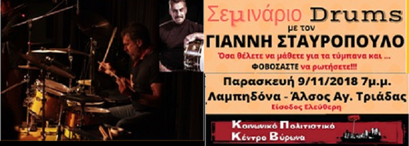 Το Κοινωνικό Πολιτιστικό Κέντρο Βύρωνα προσκαλεί τους επίδοξους και μη Drumer (τυμπανιστές ελληνιστί) στο σεμινάριο που θα λάβει χώρα στην Λαμπηδόνα την Παρασκευή 9/11/2018.