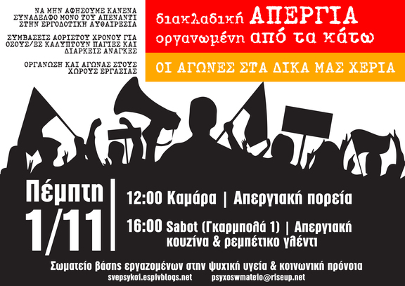 Το Σωματείο Βάσης Εργαζομένων σε ΜΚΟ και το Σωματείο Βάσης εργαζομένων στο χώρο της ψυχικής υγείας και κοινωνικής πρόνοιας στηρίζουν το κάλεσμα των 7 σωματείων που αποφάσισαν την κήρυξη διακλαδικής απεργίας την 1 Νοέμβρη. Καλούμε τους εργαζόμενους/ες στον χώρο της ψυχικής υγείας και της κοινωνικής πρόνοιας να απεργήσουν την μέρα εκείνη με κεντρική αιχμή την αναγνώριση του πραγματικού καθεστώτος εργασίας, την κατάργηση μαζικών απολύσεων και της εντατικοποίησης, τις συλλογικές συμβάσεις εργασίας και τις αυξήσεις στους μισθούς μας σύμφωνα με τις ανάγκες μας.