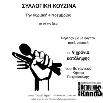 Ελάτε να γιορτάσουμε με φαγητό, ποτό και μουσικές τα εννιά χρόνια της Κατάληψης / Ελεύθερου Κοινωνικού χώρου Βοτανικός Κήπος Πετρούπολης, σας περιμένουμε με μεγάλη μας χαρά.
