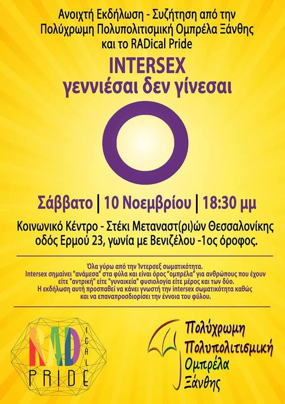 Μέλη της Πολύχρωμης Πολυπολιτισμικής Ομπρέλας Ξάνθης θα αναλύσουν κάθε πτυχή της Ίντερσεξ σωματικότητας και των σχετικών διεκδικήσεων, σε συνδιοργάνωση με το RADical Pride. Μεταξύ άλλων θα δοθεί ο ορισμός του Ίντερσεξ, θα εξεταστεί η σχέση Ίντερσεξ και Ιατρικής-Βιολογίας και θα παρουσιαστούν πτυχές της ζωής των Ίντερσεξ ατόμων στην οικογένειά τους και την κοινωνία γενικότερα.