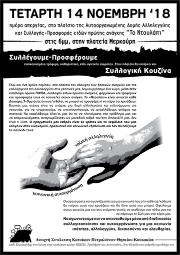 ΤΕΤΆΡΤΗ 14 ΝΟΈΜΒΡΗ '18, ημέρα απεργίας, στο πλαίσιο της Αυτοοργανωμένης Δομής Αλληλεγγύης και Συλλογής-Προσφοράς ειδών πρώτης ανάγκης "Το Ντουλάπι", στις 6μμ, στην πλατεία Μερκούρη, Συλλέγουμε - Προσφέρουμε συσκευασμένα τρόφιμα, καθαριστικά, είδη υγιεινής σώματος. Στην πλατεία θα υπάρχει και Συλλογική Κουζίνα.