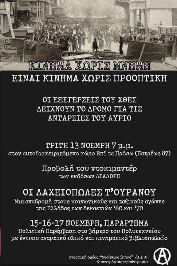 - ΤΡΙΤΗ 13 ΝΟΕΜΒΡΗ, 7 μ.μ., στον αυτοδιαχειριζόμενο χώρο Επί τα Πρόσω (Πατρέως 87)