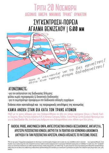 Η Παγκόσμια Ημέρα Μνήμης Τρανς Θυμάτων αποτελεί για εμάς απλώς μια αφορμή για αγώνα και όχι μια επέτειο. Δεν τιμάμε ούτε αγωνιζόμαστε μόνο "επετειακά". Αξιοποιούμε αυτή τη μέρα για να ακουστούν οι φωνές μας και αγωνιζόμαστε κάθε μέρα απέναντι στον καπιταλισμό και στις πατριαρχικές αντιλήψεις μεγάλου μέρους της κοινωνίας που εξαθλιώνουν και καταπιέζουν τα τρανς υποκείμενα, τα λοατκια+ άτομα εν γένει, τις γυναίκες, τους πρόσφυγες, ειδικά εφόσον ανήκουν στα εργαζόμενα στρώματα, στ@ άνεργ@. Αξιοποιούμε τη μέρα αυτή για να κάνουμε ορατή την τρανς ταυτότητα, να κάνουμε ένα βήμα για την εξάλειψη της τρανσφοβίας, να μιλήσουμε για τις πολλαπλές καταπιέσεις των τρανς ατόμων και της λοατκια+ κοινότητας, να αναδείξουμε την ταξική διάσταση της επίθεσης που δέχονται. Διεκδικούμε τα τρανς άτομα να μη βιώνουν κανέναν αποκλεισμό από την εργασία, την υγεία, την παιδεία. Διεκδικούμε να μπορούν να δηλώνουν όποιο φύλο επιθυμούν, σε όποια ηλικία επιλέξουν να το κάνουν και να αλλάζουν έγγραφα χωρίς χρονοβόρες και κοστοβόρες δικαστικές διαδικασίες.