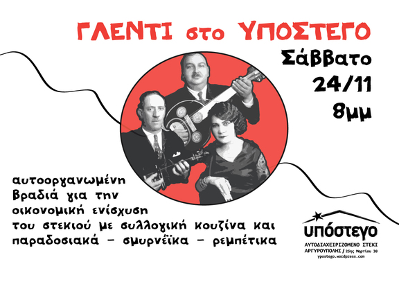 Το Σάββατο 24/11 από τις 8, βραδιά με μουσική και φαγητό για την οικονομική ενίσχυση του στεκιού. Παραδοσιακά - Σμυρνέϊκα - Ρεμπέτικα από συντροφική μπάντα. Όποιος/α θέλει μαγειρεύει φαγητό για τον αυτοοργανωμένο μπουφέ.