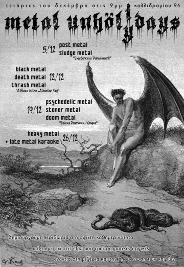 Με κεκτημένη ταχύτητα από ποστ-πανκ/οκτώβρη και χιπ-χοπ/νοέμβρη, συνεχίζουμε για ακόμα ένα μήνα τις μουσικές βραδιές και αυτή τη φορά ήρθε η σειρά του μέταλ να ζεστάνει τις κρύες Τετάρτες του Δεκέμβρη.