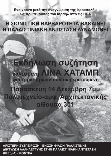 Στην εκδήλωση θα έχουμε την τιμή να έχουμε κοντά μας την πρώην πολιτική κρατούμενη Λίνα Χαντάμπ. Η Λίνα συνελήφθη στις 13 Δεκέμβρη του 2014 από τον ισραηλινό στρατό κατοχής. Eίναι φοιτήτρια στο πανεπιστήμιου του Μπιρζάϊτ. Συμμετείχε σε πορεία αλληλεγγύης στους παλαιστίνιους πολιτικούς κρατούμενους στη πόλη Μπεϊτούνια της Δυτικής Οχθης, κοντά στη φυλακή Οφέρ.Οι κατηγορίες που αντιμετώπισε στο στρατοδικείο ήταν "ρίψη πετρών" σε Ισραηλινούς στρατιώτες και " συμμετοχή σε παράνομη διαδήλωση".