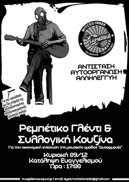 Τη Κυριακή 9/12 στις 5 το απογεματάκι φέρτε φαγητό και ελάτε για να ενισχύσουμε παρέα την μουσική ομάδα "Δυσαρμονία" της κατάληψης Ευαγγελισμού.