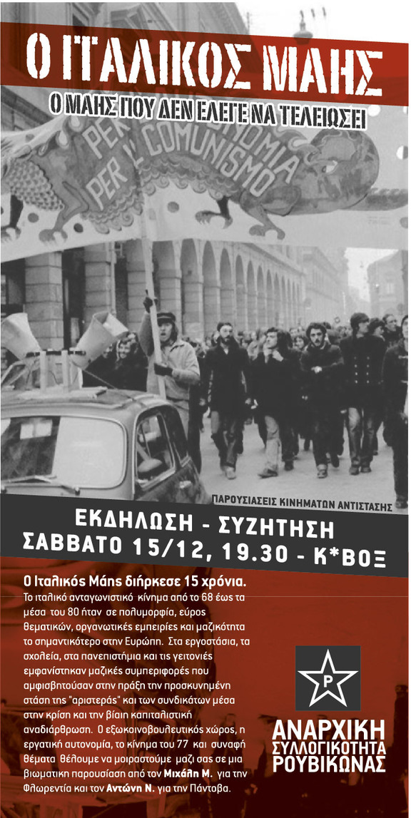 O Ιταλικός Μάης διήρκεσε 15 χρόνια. Το ιταλικό ανταγωνιστικό κίνημα από το 68 έως τα μέσα του 80 ήταν σε πολυμορφία, εύρος θεματικών, οργανωτικές εμπειρίες και μαζικότητα το σημαντικότερο στην Ευρώπη. Στα εργοστάσια, τα σχολεία, στα πανεπιστήμια και τις γειτονιές εμφανίστηκαν μαζικές συμπεριφορές που αμφισβητούσαν στην πράξη την προσκυνημένη στάση της "αριστεράς" και των συνδικάτων μέσα στην κρίση και την βίαιη καπιταλιστική αναδιάρθρωση. Ο εξωκοινοβουλευτικός χώρος, η εργατική αυτονομία, το κίνημα του 77 και συναφή θέματα θέλουμε να μοιραστούμε μαζι σας σε μια βιωματικη παρουσίαση από τον Μιχάλη Μ. για την Φλωρεντία και τον Αντώνη Ν. για την Πάντοβα
