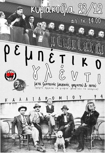 Ξημερώνοντας Κυριακή και ενώ τα τσιμέντα ακόμα θα δονούνται, πιάνουμε τα όργανα και ξανακατεβαίνουμε στο υπόγειο, για ρεμπέτικο γλέντι με φαΐ και πιοτό, για την ενίσχυση του Athens Antifa League αυτή τη φορά.