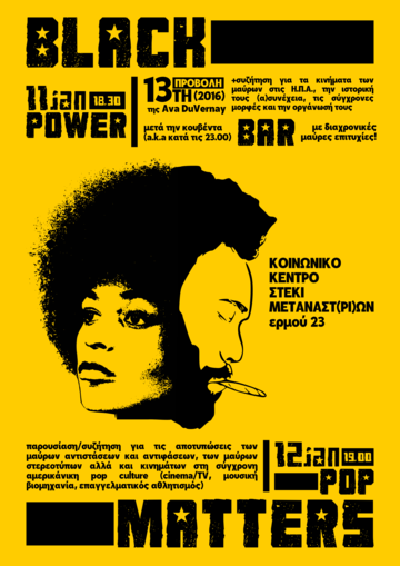 Στο διήμερο Black Power/Black Pop Matters θα αποπειραθούμε να ρίξουμε μια ματιά στα μαύρα κινήματα στις Η.Π.Α. από τα μέσα του 20ού αιώνα μέχρι και το πιο πρόσφατο Black Lives Matter κάνοντας μια αναδρομή υπό το πρίσμα της αποτύπωσης της μαύρης ριζοσπαστικότητας και των αντιστάσεων της κοινότητας στην κυρίαρχη pop culture στην Αμερική. Θα αναζητήσουμε αυτά τα ίχνη στη βιομηχανία του κινηματογράφου και των τηλεοπτικών παραγωγών, στη μουσική βιομηχανία και στις λίγκες του επαγγελματικού αθλητισμού. Παράλληλα θα δούμε πώς καταγράφονται τα στερεότυπα για τους μαύρους και πώς η κοινότητα προσπαθεί να δηλώνει τη μαύρη ταυτότητα μέσα από στις αντιφάσεις, τα όρια και διαρκώς ανάμεσα στους κινδύνους του διπόλου αφομοίωση/αποκλεισμός.