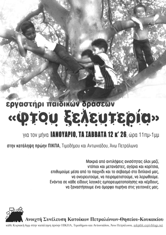 Εργαστήρι παιδικών δράσεων «φτου ξελευτερία», τα Σάββατα 12 και 26 Ιανουαρίου 2019, ώρα 11πμ-1μμ, στην κατάληψη πρώην ΠΙΚΠΑ, Τιμοδήμου και Αντωνιάδου, Άνω Πετράλωνα