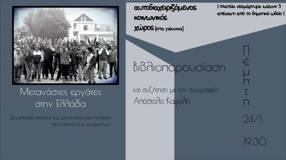 Στις 24/01 παρουσίαση του βιβλίου «Μετανάστες εργάτες στην Ελλάδα», εργασιακές σχέσεις και μεταναστευτική πολιτική στην εποχή των μνημονίων και συζήτηση με τον συγγραφέα Απόστολο Καψάλη.