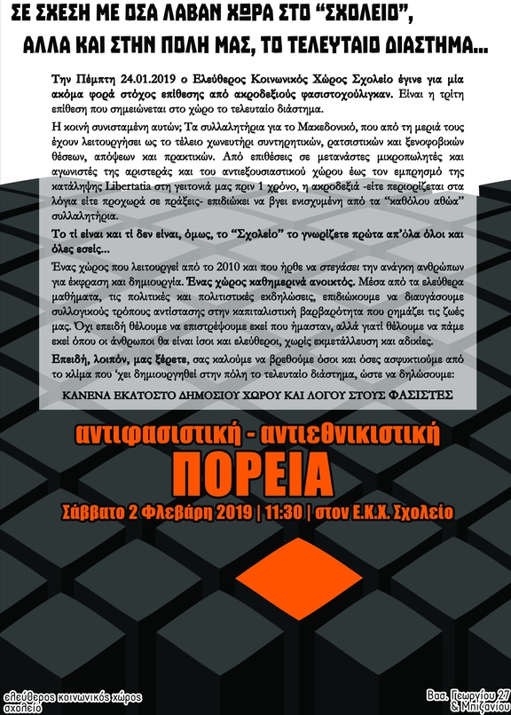 Την Πέμπτη 24 Ιανουάριου ο ελεύθερος κοινωνικός χώρος «Σχολείο» δέχθηκε επίθεση από ομάδα φασιστοχουλιγκάνων και λοιπών εθνικιστών που αποκόπηκε από το «συλλαλητήριο για την Μακεδονία». Ο συγκεκριμένος χώρος έχει στοχοποιηθεί και έχει δεχθεί παρόμοιες επιθέσεις άλλες δύο φορές, πάλι στον απόηχο των «κινητοποιήσεων για την Μακεδονία». Αντιπροσωπευτικό της κίνησης αυτής της ομάδας είναι το γεγονός ότι αμέσως μετά την επίθεση στο «Σχολείο», κατευθύνθηκαν προς τα πανεπιστήμια όπου τραμπούκισαν φοιτητές/τριες στην λέσχη του Α.Π.Θ. και βανδάλισαν το μνημείο του εβραϊκού νεκροταφείου που βρίσκεται στο campus του πανεπιστημίου.