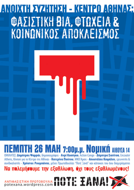 Απέναντι στην κρατικά κατευθυνόμενη ανθρωποφαγία, τη φασιστική τρομοκρατία, τα ρατσιστικά πογκρόμ, καθώς και την παρόξυνση της κοινωνικής εξαθλίωσης, συζήτηση με θέμα: Κέντρο της Αθήνας: Φασιστική βία-φτώχεια-κοινωνικός αποκλεισμός