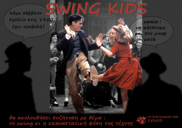 Για όλους εσάς και όχι μόνο, η ομάδα Swing του ΕΚΧ Σχολείο ετοιμάζει αυτό το Σάββατο στις 19:00, την προβολή μιας ιδιαίτερης ταινίας σχετικά με τον χορό αυτό και την ιστορία του: το Swing Kids. Την ταινία θα ακολουθήσει συζήτηση με θέμα: το Swing και η επαναστατική φύση της τέχνης, όπως και μπαρ για την οικονομική ενίσχυση του Σχολείου. Σας περιμένουμε!