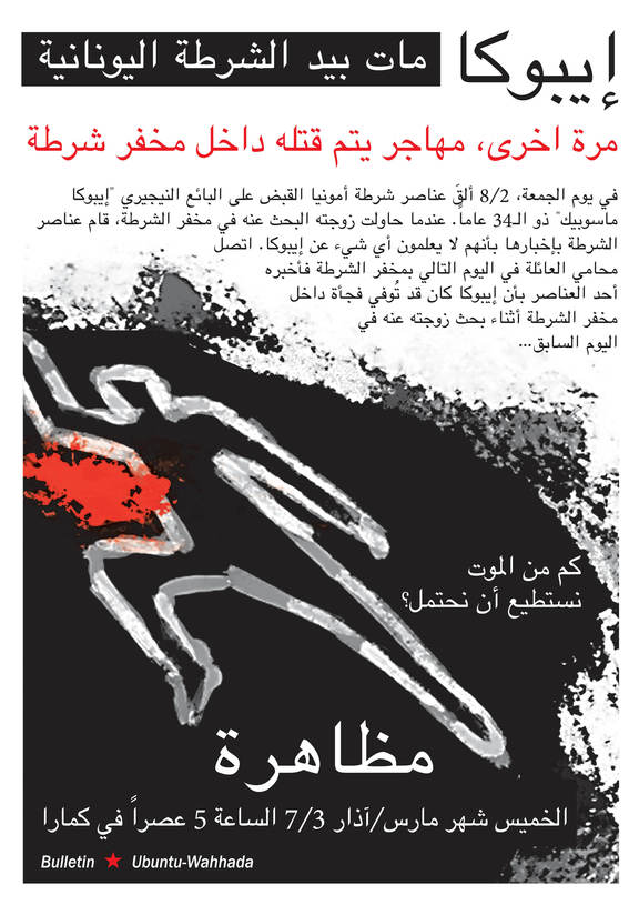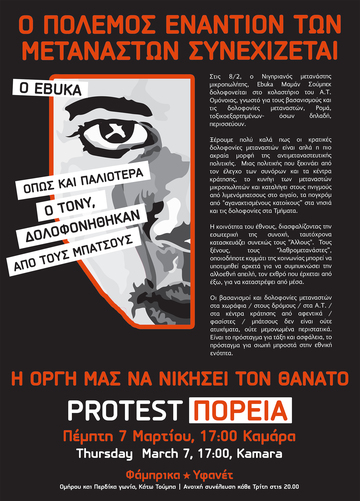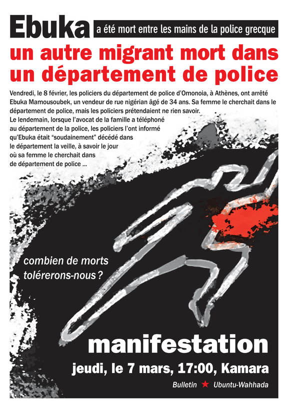 Στις 8 Φεβρουαρίου ο Ebuka αφρικανός μετανάστης και πατέρας 2 παιδιών που εργαζόταν ως μικροπωλητής προσάγεται από μπάτσους εν ώρα εργασίας και μεταφέρεται στο ΑΤ Ομόνοιας. Ενώ είναι δεμένος με χειροπέδες βρίσκεται νεκρός μέσα στο αστυνομικό τμήμα κάτω από «αδιευκρίνιστες συνθήκες». Οι μπάτσοι έκρυψαν το θάνατο του Εμπουκά για 24 ώρες από την οικογένεια του και με απίστευτη κυνικότητα ζήτησαν από την γυναίκα του να κάνει δήλωση εξαφάνισης, ενώ οι ίδιοι προωθούσαν την απέλαση της σωρού του στην Νιγηρία. Η γνωστοποίηση του θανάτου του Εμπουκά ξεκίνησε από την Οργάνωση Ενωμένων Γυναικών Αφρικής. Η ανακοίνωση έγραφε: «Ένας άνδρας από τη Νιγηρία, από την κοινότητά μας, δολοφονήθηκε πριν λίγες μέρες στην Ομόνοια από την ελληνική αστυνομία. Χρειάζεται να βγούμε έξω και να φωνάξουμε».