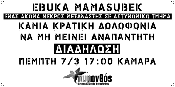 Θεσσαλονίκη, Πέμπτη 7 Μαρτίου στις 17.00: Διαδήλωση για τη δολοφονία του Ebuka