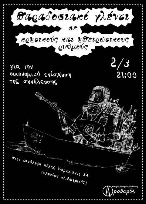 Παραδοσιακό γλέντι σε κρητικούς και ηπειρώτικους ρυθμούς για την οικονομική ενίσχυση της αναρχικής φοιτητικής συνέλευσης Αροδαμός, Σάββατο 2/3 21:00, στην κατάληψη Λέλας Καραγιάννη 37 (πλ. Πλατείας Αμερικής).