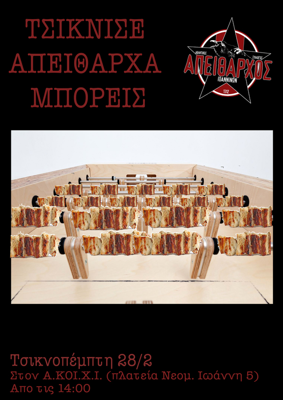 Τσικνοπέμπτη 28/2 με κοράκια που θα χορεύουν σε ρυθμούς sampa και εκτός γηπέδων απο τις 14:00.τα έσοδα θα διατεθούν για την οικονομική ενίσχυση του Αυτοοργανομένου Αθλητικού Συλλόγου Απείθαρχος Ιωαννίνων.