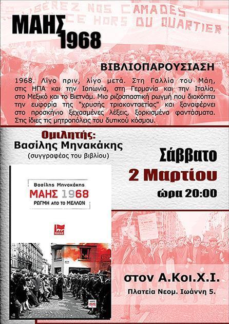 Βιβλιοπαρουσίαση του «Μάης 1968: Ρωγμή από το μέλλον» , με ομιλητή τον συγγραφέα του, Βασίλη Μηνακάκη. Στον Αυτοδιαχειριζόμενο Κοινωνικό Χώρο Ιωαννίνων, 2 Μαρτίου στις 20.00.