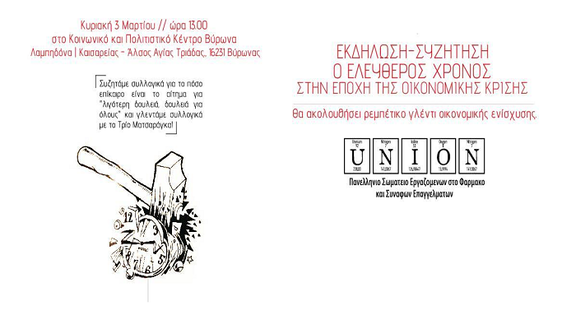 Την Κυριακή 3 Μαρτίου στις 13.00 σας καλούμε να συζητήσουμε για τον ελεύθερο χρόνο στην εποχή της οικονομικής κρίσης στη ΛΑΜΠΗΔΟΝΑ (Δασύλλιο Αγ. Τριάδας-Βύρωνας)