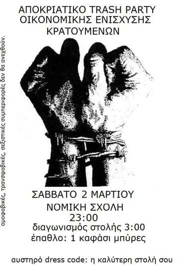 Θα στείλουμε αλλυλέγγυο μήνυμα χαράς εκεί μέσα πως τους περιμένουμε για να διασκεδάσουμε μαζί ξανά. Μα και να δείξουμε και σε όλους όσους μας θέλουν κοιμισμένους και φοβισμένους πως εμείς μαζευόμαστε και διασκεδάζουμε καθώς ονειρευόμαστε την εξέγερση. Να τους δείξουμε πως ακόμα και να μας χτυπούν, φυλακίζουν ή σκοτώνουν πως ο νούς μας θα αποδρά πίσω στη γιορτή και την χαρά και πως ονειρευόμαστε την ώρα και τη στιγμή που θα χορέψουμε πάνω στους τάφους τους...Οι σκλάβοι των αφεντικών και όσοι δίνουν διαταγές επιθυμούν να είμαστε σαν νεκροί, να είμαστε φοβισμένοι, να παραδινόμαστε στη κατάθλιψη και να μένουμε κλεισμένοι και αμέτοχοι στα σπίτια μας. Αλλά δεν θα περάσει αυτό. Θα μαζευόμαστε σε πλατείες, καταλήψεις, στέκια κι θα διασκεδάζουμε. Θα χορεύουμε, θα τραγουδάμε και ξεφαντωνουμε καθώς ζυγώνει η ημέρα της εξέγερσης.