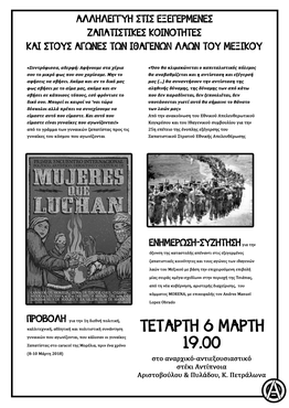ΕΝΗΜΕΡΩΣΗ-ΣΥΖΗΤΗΣΗγια την όξυνση της καταστολής απέναντι στις εξεγερμένες ζαπατιστικές κοινότητες και τους αγώνες των ιθαγενών λαών του Μεξικού με βάση την επιχειρούμενη επιβολή μίας σειράς «μέγα-σχεδίων» στην περιοχή της Τσιάπας, από τη νέα κυβέρνηση, αριστερής διαχείρισης, του κόμματος ΜORENA, με επικεφαλής τον Andres Manuel Lopez Obrado.