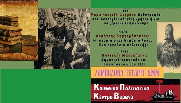 Το Κοινωνικό Πολιτιστικό Κέντρο Βύρωνα σας προσκαλεί στην εκδήλωση-συζήτηση που θα πραγματοποιηθεί την Τετάρτη 13 Μαρτίου, στις 8 μ.μ. στη Λαμπηδόνα, με θέμα: Η ιστορία στο δημόσιο λόγο. Ένα εργαλείο πολιτικής; Θα μιλήσει ο Δημήτρης Δημητρόπουλος.