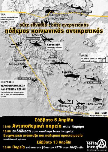 Το τσάκισμά των μισθών και των ζωών μας δεν είναι αρκετό για να συνεχιστεί η κερδοφορία για τα αφεντικά, ενώ η καπιταλιστική κρίση βαθαίνει. Αρκετή δεν είναι και η ανυπολόγιστη περιβαλλοντολογική ζημιά από τις εξορύξεις υδρογονανθράκων σε βουνά και θάλασσες. Η τυχοδιωκτική και φιλοπόλεμη στρατηγική του Ελληνικού κράτους που φιλοδοξεί να μετατραπεί σε σερίφη της περιοχής και ηγέτιδα δύναμη των Βαλκανίων, πηγαίνει χέρι-χέρι με τους πολιτικούς, οικονομικούς, ενεργειακούς και στρατιωτικούς σχεδιασμούς της Ε.Ε. και του ΝΑΤΟ. Η πολεμική του προετοιμασία περιλαμβάνει την στρατιωτική και οικονομική συνεργασία με Ισραήλ-Κύπρο-Αίγυπτο, την αγορά νέων οπλικών συστημάτων, την άνοδο του μιλιταρισμού και του εθνικισμού ενώ συνοδεύεται από την όλο και πιο έντονή παρουσία και στρατοπέδευση των αυτοκρατορικών στρατευμάτων του ΝΑΤΟ στην περιοχή (Αλεξανδρούπολη, Λάρισα, Άραξο, Αιγαίο). Ένα νέο μελλοντικό πολεμικό επεισόδιο, εδώ ή λίγο πιο δίπλα φαντάζει όλο και πιο πιθανό...