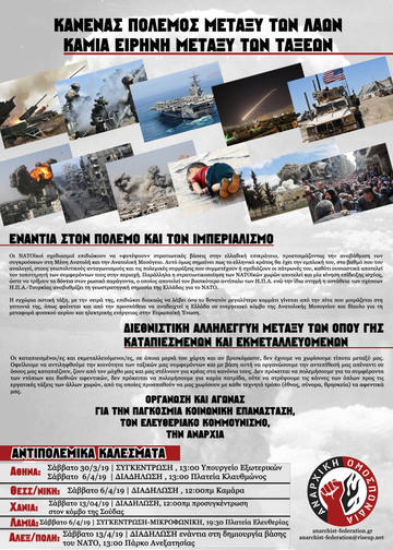 Τη στιγμή που ο ρόλος του ελληνικού κράτους βαθαίνει στους σχεδιασμούς του ΝΑΤΟ (βλ. αναβάθμιση των ήδη υπαρχουσών βάσεων και δημιουργία νέων, συμμετοχή σε ενεργειακούς και στρατιωτικούς συμμαχικούς άξονες με το Ισραήλ, την Αίγυπτο και την Κύπρο), ενώ παράλληλα οι πολεμικές μηχανές των κυρίαρχων αλλού ζεσταίνονται και αλλού δολοφονούν ανθρώπους της τάξης μας, κρίνουμε ως επιτακτική ανάγκη τη συγκρότηση ενός αντιπολεμικού-αντιμιλιταριστικού κινήματος στη βάση της προλεταριακής ενότητας και της διεθνιστικής ταξικής αλληλεγγύης.