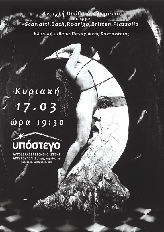 Την Κυριακή 17/3 στο πλαίσιο του Κυριακάτικου καφενείου το Υπόστεγο φιλοξενεί την Πρόβα Διπλώματος του Παναγιώτη Κοντονάσιου σε έργα Scarlatti, Bach, Rodrigo, Britten, Piazolla.