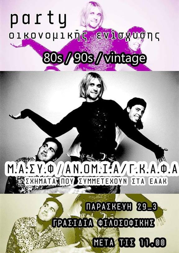 Είμαστε σχήματα που συμμετέχουν στα ΕΑΑΚ (στην Αρχιτεκτονική, στο Ιστ.-Αρχ. και το Γαλλικό). Επειδή λοιπόν είμαστε ανεξάρτητοι από κόμματα - δηλαδή τα υλικά της παρέμβασης μας τα πληρώνουμε από την τσέπη μας, σας περιμένουμε όλους στα γρασίδια της Φιλοσοφικής στις 29/3 σε ένα πάρτυ οικονομικής ενίσχυσης των σχημάτων μας. Θα παρτάρουμε μέχρι το πρωί.