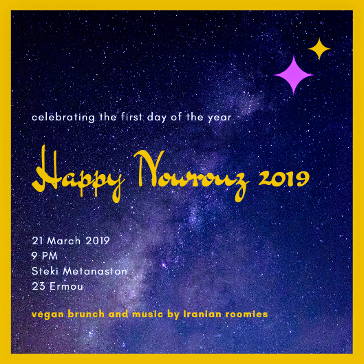 Θα'ναι σαν να μπαίνει η άνοιξη αυτήν την Πέμπτη στο Κοινωνικό Κέντρο / Στέκι Μεταναστών, με τους Ιρανούς φίλους μας να μας υποδέχονται με παραδοσιακά φαγητά και μουσικές. Θα ζωντανέψουμε τη βάρδια στο Στέκι με μυρωδιές και θα γιορτάσουμε τον ερχομό της Άνοιξης σαν την 1η μέρα του χρόνου.