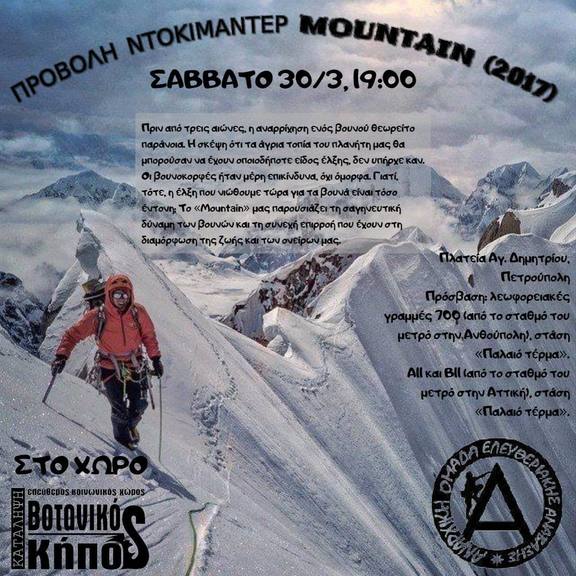 Πριν από τρεις αιώνες, η αναρρίχηση ενός βουνού θεωρείτο παράνοια. Η σκέψη ότι τα άγρια τοπία του πλανήτη μας θα μπορούσαν να έχουν οποιοδήποτε είδος έλξης, δεν υπήρχε καν. Οι βουνοκορφές ήταν μέρη επικίνδυνα, όχι όμορφα. Γιατί, τότε, η έλξη που νιώθουμε τώρα για τα βουνά είναι τόσο έντονη; Το «Mountain» μας παρουσιάζει τη σαγηνευτική δύναμη των βουνών και τη συνεχή επιρροή που έχουν στη διαμόρφωση της ζωής και των ονείρων μας.