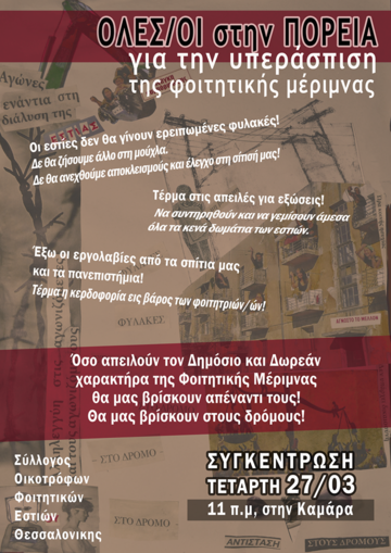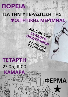 - Πορεία για τη φοιτητική μέριμνα με συγκέντρωση στην Καμάρα την Τετάρτη 27/3/19 στις 11:00