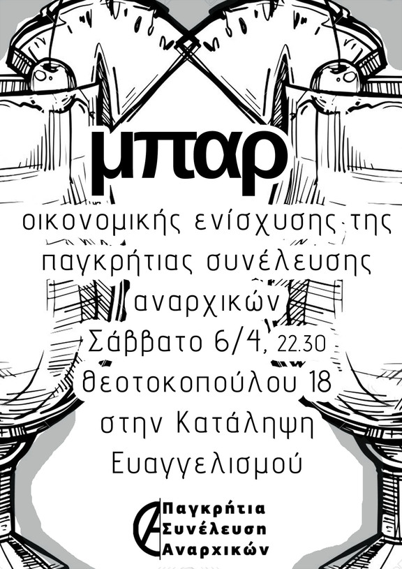 Το Σάββατο 6 Απριλίου στις 22.30 θα πραγματοποιηθεί μπαρ οικονομικής ενίσχυσης της παγκρήτιας συνέλευσης α/α στην κατάληψη Ευαγγελισμού (θεοτοκοπούλου 18).